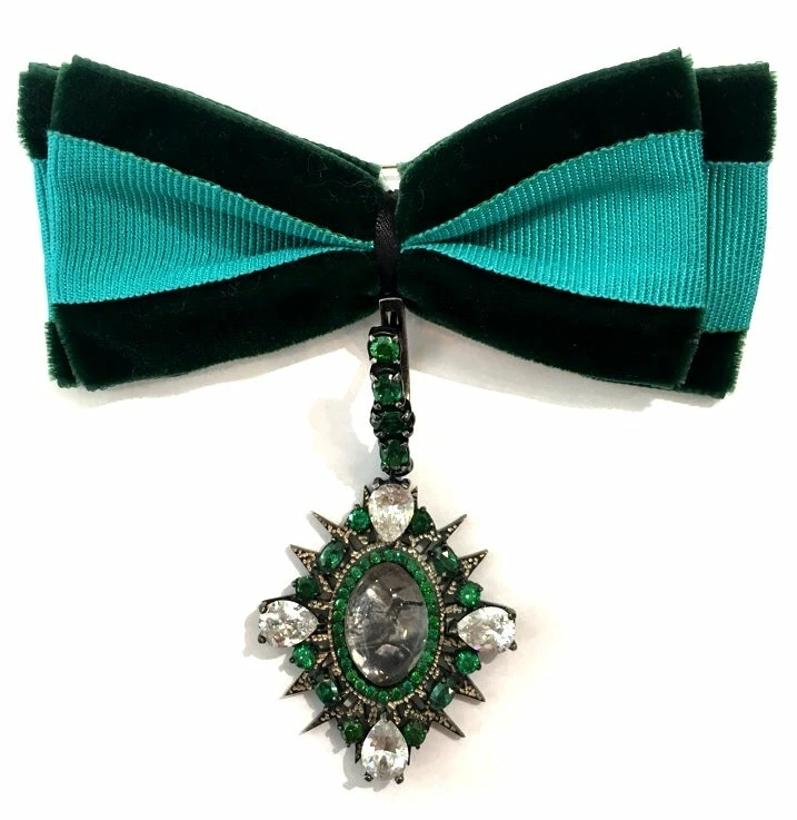 DD-000031 404 Djanelli Jewelry KISS (BREZHNEVandHANNEKEN) brooch/32gr.silver/Bl.rhodium/quartz/bow