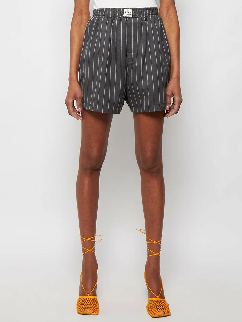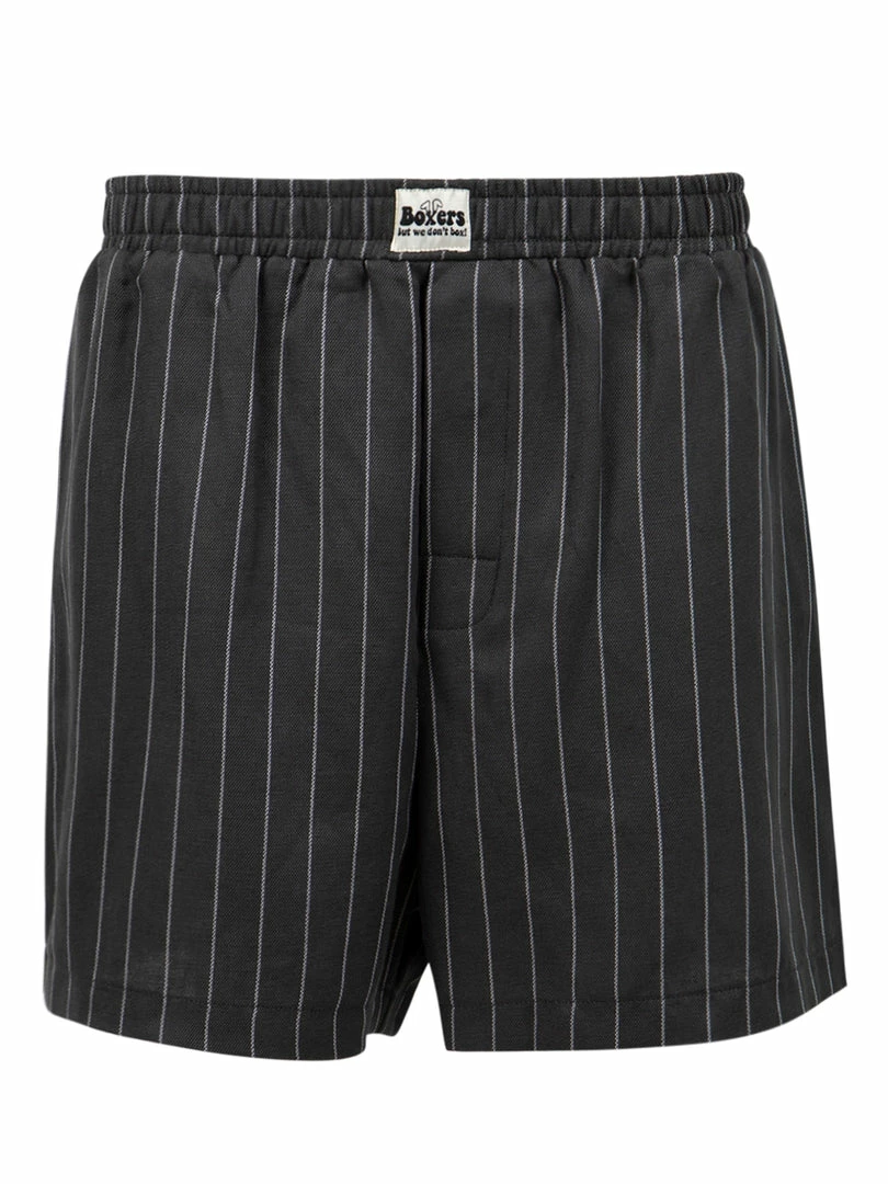 Pinstripe black boxer shorts featuring an elastic waistband and a relaxed fit. Pair with matching blazer and strappy sandals to complete this edgy look.