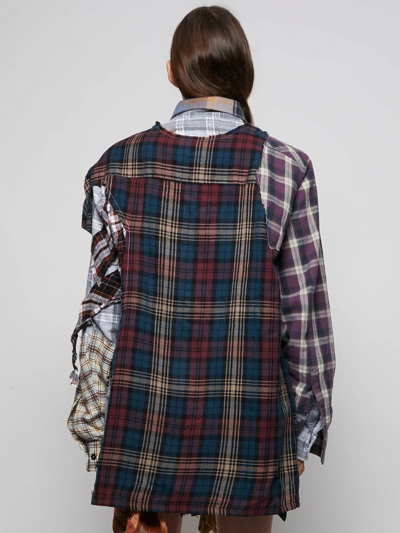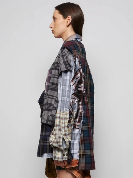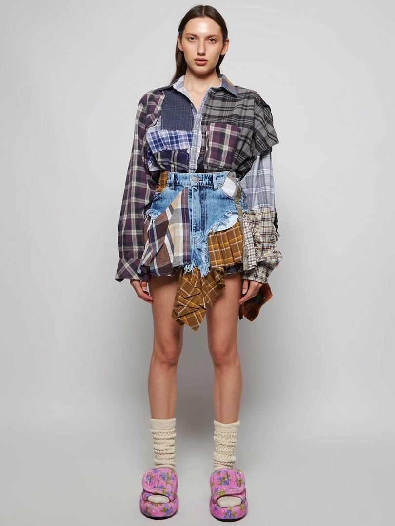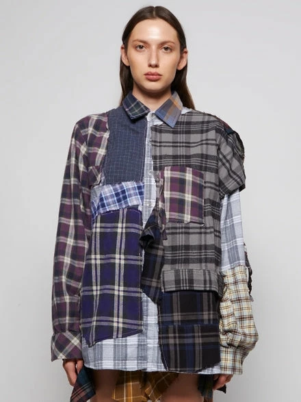 Upcycled patches check print shirt by Natasha Zinko crafted from soft cotton featuring a relaxed silhouette with multiple embroidered patches in different colored check prints throughout, a classic spread collar with a front button-down closure, long sleeves with working barrel cuffs, and a straight hemline. Coordinate under a blazer jacket with elegant slacks, and leather slip-on mule shoes for a cool yet artsy dinner party edit.