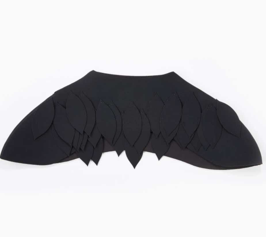 Place the cape plume on the shoulders. Slip it on by the collar. The cape is composed of two loops inside which allow passing the straps of the bra through.