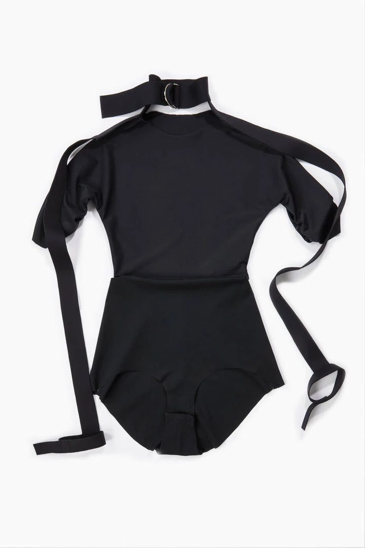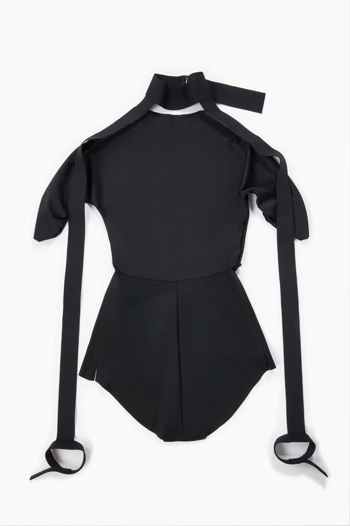 80 % polyamide, 20 % elastane. The accessories of the bodysuit are sewed and fused. Each part includes a polyurethane film. Inside leg lining 100 % cotton