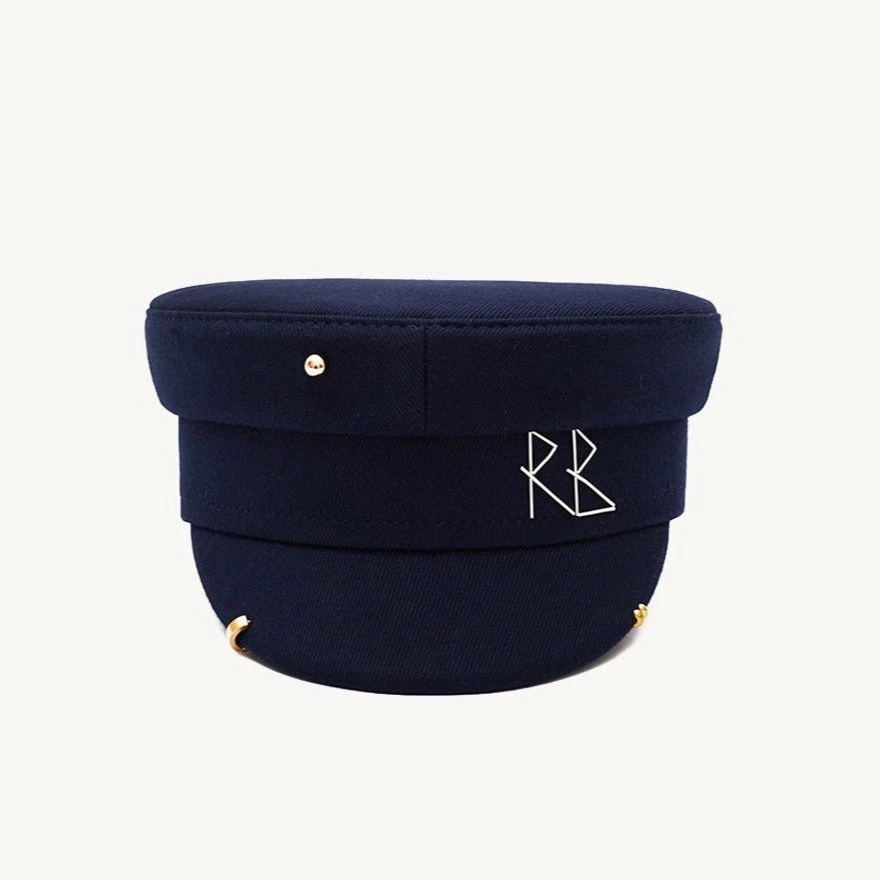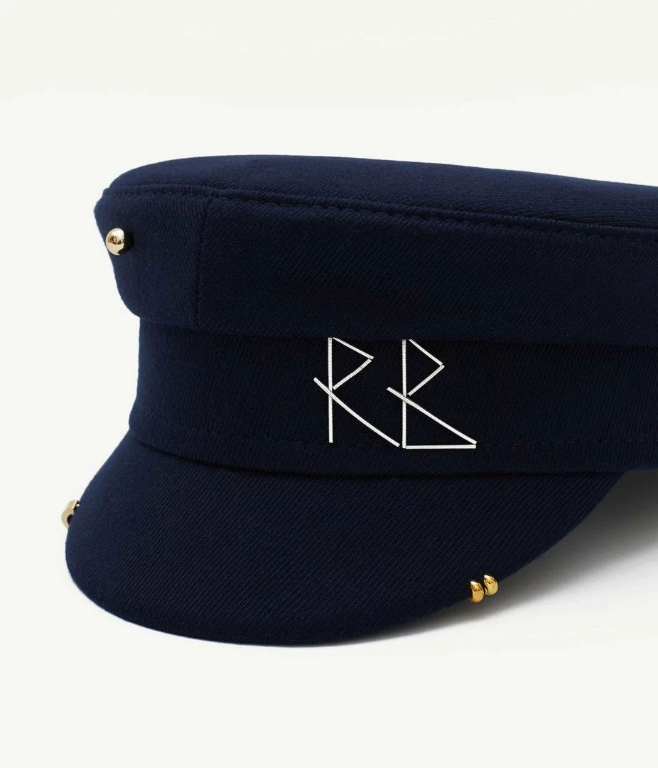 Baker boy cap is a signature style of Ruslan Baginskiy brand. Designer adds an rebel vibe to our famous shape with gold-tone embellishments. Coordinate it with your favorite jeans and biker jacket.