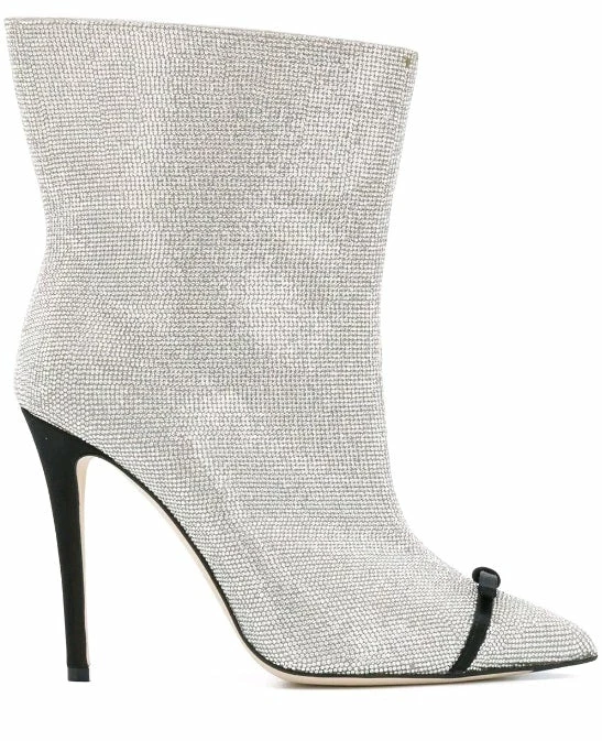 Silver-tone calf leather boots with rhinestones and bow from Marco De Vincenzo featuring a pointed toe, a side zip fastening, a branded insole and a 105mm stiletto heel.