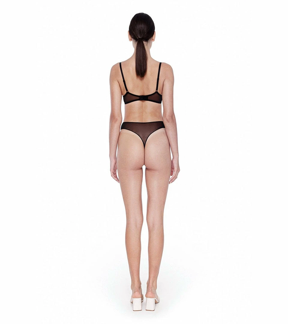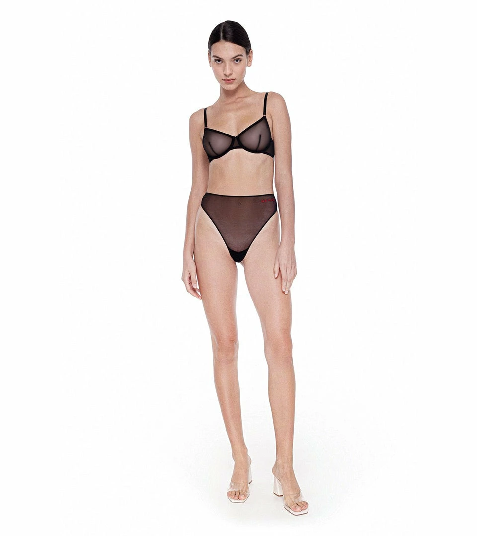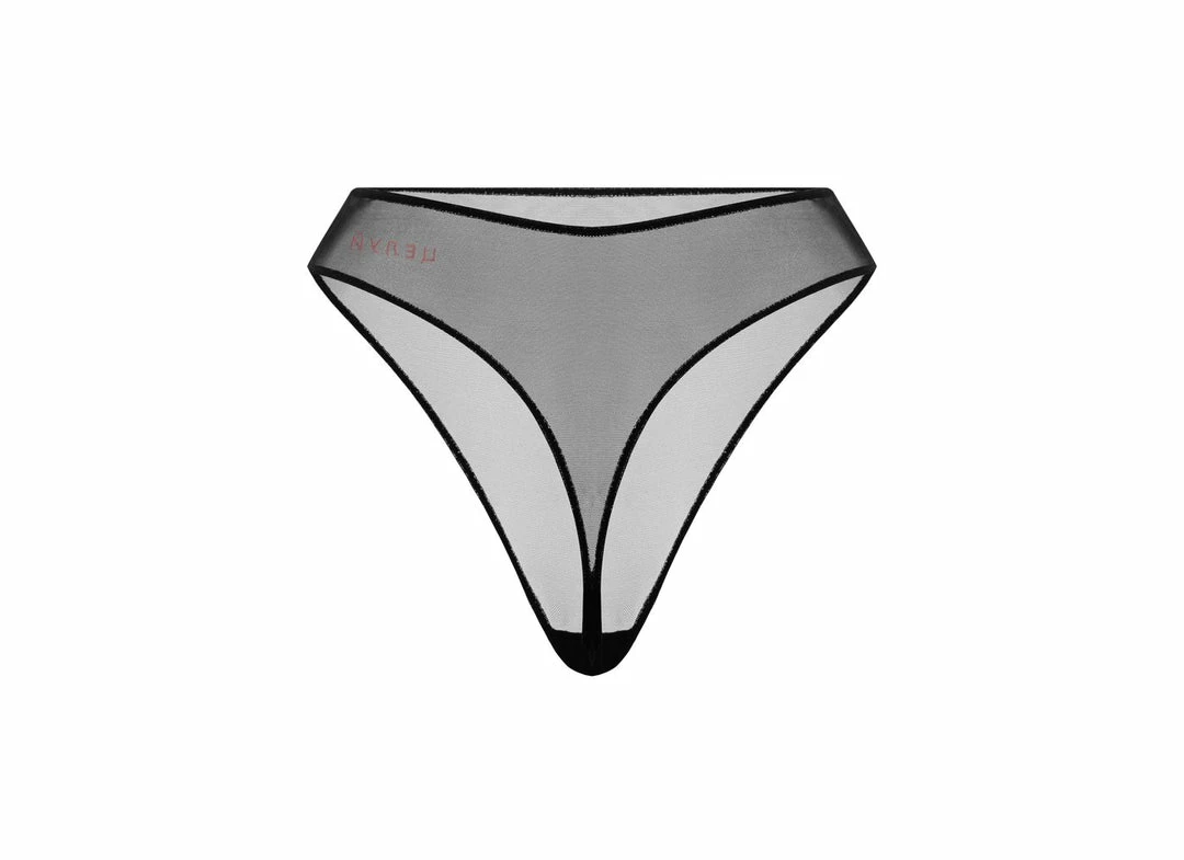 High-waist brief made of transparent stretch-tulle, with original embroidery in front.